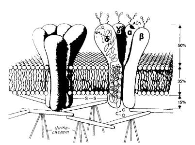 Сборка многих субъединичных комплексов, содержащих разные субъединицы, тоже, по-видимому, происходит в эндоплазматическом ретикулуме. Примером служит никотиновый ацетилхолиновый рецептор, который содержит две α-субъединицы и по одной β-, γ- и δ-субъединице (рис.4).