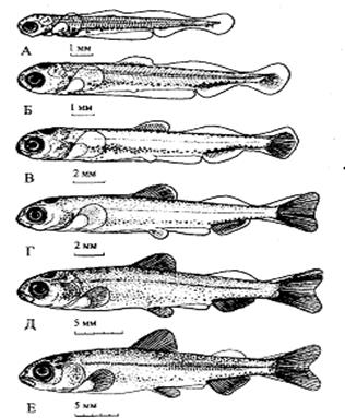 А - личинка, средняя длина 10,9 мм, III этап развития; Б - личинка, средняя длина 13,2 мм, конец III - начало IV этапа; В - личинка, средняя длина 18,2 мм, середина IV этапа; Г - личинка, средняя длина 21,3 мм, конец IV этапа; Д - личинка, длина до 28 мм, середина V этапа; Е - малёк, средняя длина 32,3 мм (А.П.Петлина 2004).