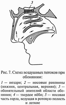 Орган обоняния находится в носовой полости. Обонятельный эпителий занимает площадь 3-5см 2, имеет желтый цвет благодаря присутствию зернышек красящего вещества в особых чувствительных клетках, расположенных в слизистой оболочке верхней части перегородки носа, свода носа и других областях. Обонятельный эпителий, расположенный в верхней части носовой полости, находится в прямой связи с ротовой полостью. Молекулы летучих ароматобразующих веществ, находящиеся в ротовой полости, легко попадают через носоглотку в носовую полость (рис. 7.).