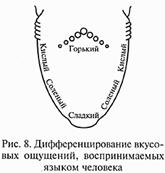 Рецепторы вкуса на языке имеют явно выраженную специфичность. На самом кончике языка и по краям расположены крупные грибовидные сосочки, в каждом из которых по 8-10 луковиц. Сладкий вкус более всего ощущается концом языка, соленый - краями передней части языка, кислый - краями задней части языка. У основания языка находятся желобковатые сосочки в каждом из которых по 100-150 вкусовых луковиц, воспринимающих горький вкус.