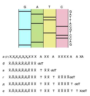 Рис. 2. Схема метода Сенгера и схематичное представление фрагмента радиоавтографа геля с соответствующей ему последовательностью нук-леотидов.Хи X -произвольныекомплементарные остатки нуклеотидов. Пронумерованы индексами остатки, входившие в состав праймера. dA - остатки дезоксиаденозинового нуклеотида в составе анализируемой ДНК. dT и ddT - остатки тимидин монофосфата и дидезокситимидин монофосфата, включившиеся в новые цепи ДНК, полученные при репликации с помощью ДНК-полимеразы