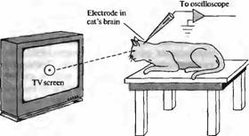 Рис. 6. Стимуляция сетчатки при помощи различных световых образов. Адаптировавшиеся глаза кошки или обезьяны, находящейся под наркозом, направляют в сторону кино - или телевизионного экрана, на котором показаны различные световые образы, генерируемые компьютером и/или спроецированные проектором. При этом при помощи электрода регистрируют ответы отдельного нейрона путей зрительного анализатора. Световые пучки, возникающие в определенной области экрана, увеличивают или уменьшают частоту разрядов данного нейрона. Таким образом может быть очерчено рецептивное поле этой клетки при помощи определения границ зон на экране, представление которых вызывает изменение частоты импульсации. В оригинальных экспериментах Kuffler направлял свет прямо в глаз при помощи специально сконструированного офтальмоскопа.