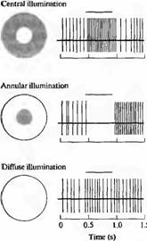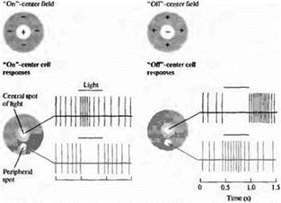 При регистрации сигналов от одной ганглиозной клетки прежде всего важно найти границы ее рецептивного поля. Характерной особенностью большинства ганглиозных клеток и нейронов зрительной системы является то, что они периодически дают редкие разряды в покое, даже при отсутствии освещения. Соответствующие световые стимулы не обязательно вызывают активизацию ганглиозных клеток, они могут просто модулировать спонтанную импульсацию; при этом ганглиозные клетки отвечают либо увеличением, либо уменьшением частоты сигналов.