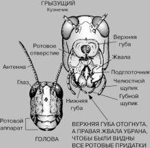 Рот насекомых имеет различное строение в зависимости от способа питания. Выделяют ротовой аппарат грызущего (жуки, муравьи, прямокрылые), лакающего (пчелы, шмели), колющего (комары, клопы), сосущего (бабочки), лижущего типа (мухи). По всей видимости, наиболее примитивным является ротовой аппарат грызущего типа. на это указывает наличие такого рта у личинок отрядов насекомых, у которых во взрослом состоянии есть ротовые аппараты других типов, богатая расчлененность придатков, сходство с ротовыми органами многоножек (по одной из гипотез, насекомые произошли от многоножек или имеют общих с ними предков). Предполагается, что первичным для насекомых было питание мелкими останками животного или растительного происхождения, из него впоследствии развились остальные типы питания. Эти представления согласуются с предположением о примитивности грызущего ротового аппарата больших бугорков. Ротовой аппарат включает верхнюю губу (labrum), пару верхних и нижних челюстей, нижнюю губу и гипофаринкс (hypopharynx). Верхняя губа представляет собой складку покровов головы, гипофаринкс (язык, подглоточник) – выпячивание дна ротовой полости. Пара верхних челюстей (жвал, или мандибул) является конечностями II сегмента головы (I сегмент и его придатки почти полностью редуцированы). Эти мощные нерасчлененные пластинки, зазубренные по внешнему краю, играют основную роль в разгрызании пищи. У примитивных насекомых верхние челюсти соединяются с головной капсулой одним сочленением (мыщелком) и способны двигаться в разных плоскостях. Их движения менее точны и сильны по сравнению с движениями двумыщелковых верхних челюстей продвинутых насекомых. Челюсти последнего типа могут двигаться только в одной плоскости.