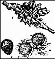 Бодяга на ветке, упавшей в воду (1), ее личинка (2), геммула (3) и молодая особь (4). 2, 3 и 4 увел.