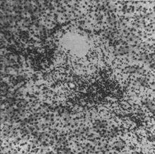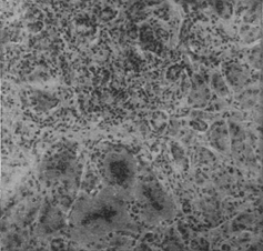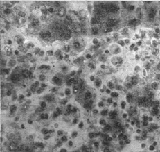 Морфологическим своеобразием отличается Б. б. у новорожденных, возникающая в результате трансплацентарной передачи вируса плоду от беременной больной или вирусоносительницы. Своеобразие это заключается в присутствии многоядерных гигантских клеток типа симпластов, встречающихся при вирусном гепатите также у детей раннего возраста (рис. 3), иногда и у взрослых. Есть основания предполагать (Тер-Григорьева), что внутрипеченочные атрезии желчных путей, обнаруживаемые у новорожденных, могут быть патогенетически связаны или с внутриутробным гепатитом плода, или с порочным развитием печени плода в результате трансплацентарного воздействия вирусной инфекции беременной. Описываются также врожденные