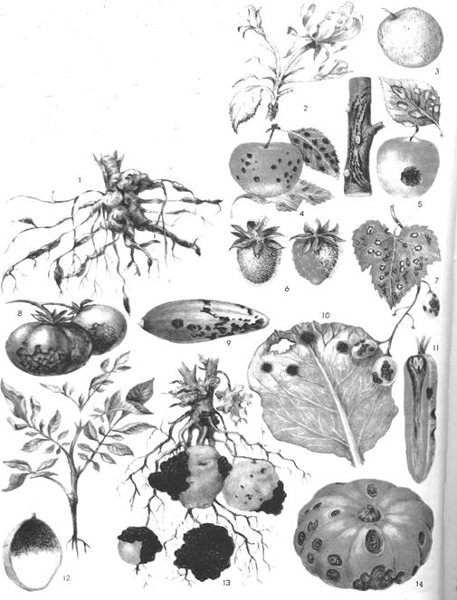 Болезни растений: 1 – кила капусты, 2 – мучнистая роса яблони, 3 – лептотириоз плодов яблони, 4 – парша яблони, 5 – черный рак яблони, 6 – серая гниль земляники, 7 – антракноз винограда, 8 – фитофтороз томата, 9 – бактериоз огурца, 10 – альтернариоз капусты, 11 – черная гниль моркови, 12 – черная ножка картофеля, 13 – рак картофеля, 14 – антракноз тыквы.