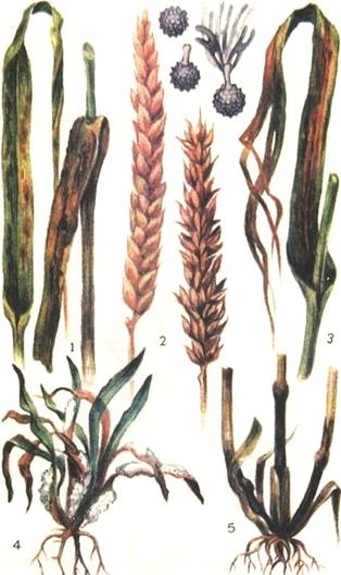 Болезни растений: 1 – бурая ржавчина пшеницы и ржи; 2 – головня пшеницы (слева – здоровый колос, вверху – головневые споры); 3 – полосатая пятнистость ячменя; 4 – снежная плесень; 5 – стебли пшеницы, пораженные афиоболезом; 6 – мучнистая роса