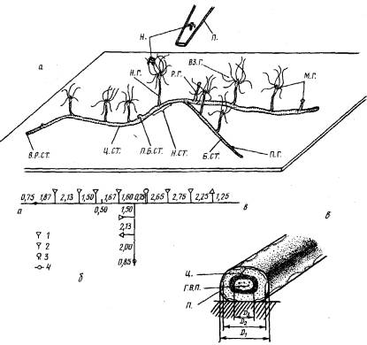 1—взрослый гидрант; 3—молодой гидрант; 3—редуцирующийся гидрант; 4—почка гидранта; в — схема поперечного среза столона. Промеры диаметров: D1 — перисарка (П.); D2.—ценосарка (II.); D3—гастроваскулярной полости (Г. В. П.)