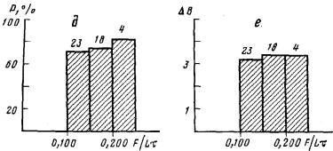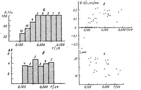 Рис. 6. Влияние литания на ветвление гидроризы колонии. Цифры над гистограммами указывают объем выборок, а—зависимость вероятности образования почек боковых столонов (Р) от интенсивности питания (F/Lr) при равномерном кормлении; б—зависимость числа почек боковых столонов (В) от интенсивности питания (F/Lt) при равномерном кормлении; в — изменение показателя раэветвленности гидроризы (В — 2/L) в зависимости от интенсивности питания {F/Lt} при равномерном кормлении; г — значения интенсивности питания н размера колонии (L), при котором произошло ветвление в колониях при равномерном кормлении; д—зависимость вероятности образования почек боковых столонов (Р) от интенсивности питания {F/Lt} при импульсном кормлении; е—зависимость числа почек боковых столонов (6) от интенсивности питания {F/Lt} при импульсном кормлении