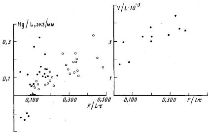 Рис, 8. Зависимость удельного объема ткани ценосарка столона (V/L) от интенсивности питания {F/Lt)
