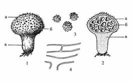 Рисунок 7. - Строение плодового тела гастеромицетов: 1 – дождевик шиповатый (а – шип экзоперидия, б – эндоперидий, в – ложная ножка), 2 – разрез плодового тела дождевика шиповатого (а – камеры, б – трама, в – бесплодный столбик), 3 – базидиоспоры, 4 – капиллиций