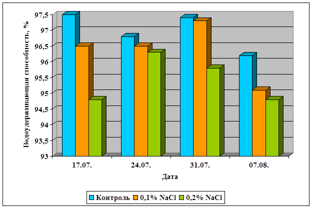 Так при концентрации соли 0,1%, водоудерживающая способность уменьшилась от 0,1 до 1,1% по сравнению с контролем, а при 0,2% - от 0,5 до 2,7%, что можно видеть на рисунке 3. В среднем водоудерживающая способность понизилась на 0,6% при 0,1% концентрации NaCl; и на 1,6% при 0,2% засолении.