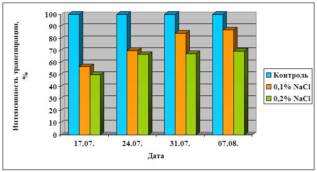 Содержание воды и водоудерживающая способность – это не единственные показатели водного обмена растений. Более важным критерием является интенсивность транспирации. В таблице 4 и на рисунке 4 приведены данные по влиянию уровня засоления на этот показатель.
