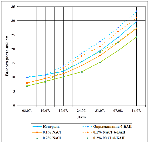 На рис.5 представлен график ростовых процессов опытных растений. Как видно, максимальной величиной характеризуются растения, выращенные на незасоленной почве и обработанные 6-БАП. Опрыскивание синтетическим аналогом цитокинина в некоторой степени снимает угнетающие действие солей на рост растений, о чем может свидетельствовать тот факт, что растения, выращенные при 0,1% концентрации NaCl и обработанные 6-БАП, оказались в среднем на 12% выше контрольных. Вышесказанное свидетельствует о том, что 6-БАП способствует нормализации ростовых процессов, что говорит о повышении адаптивных возможностей растительного организма. Полученные данные находят отражение в литературе [14, 51].