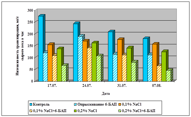 Повышение содержания воды в листьях кукурузы после обработки 6-БАП коррелирует с уменьшением интенсивности транспирации. Так для контрольных растений, обработанных 6-БАП, снижение транспирации составило от 22 до 55,8%, по сравнению с необработанными. Для растений, произраставших при 0,1% засолении, эти цифры составляют 17,2-57,6%; при 0,2% - от 33,8 до 62%.