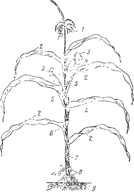 6 - влагалище листа, 7 – стебель, 8 – воздушные корни, 9 – корневая система.
