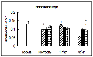 Таким образом, введение этанола вызывало примерно одинаковые изменения активности КПМ в гипоталамусе и стриатуме. Интересно отметить, что в стриатуме и гипоталамусе отсутствовала зависимость активности фермента от дозы вводимого этанола.