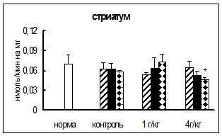 Через 0,5 часа после введения этанола в дозе 1 г/кг в гипоталамусе активность КПМ была на 21% выше, чем в контроле. Через 18 часов после инъекции этилового спирта в дозе 4 г/кг активность фермента в гипоталамусе и стриатуме была на 18-19% ниже, чем в контроле. Интересно отметить, что достоверных отличий во влиянии разных доз этанола на активность КПМ не выявлено (рис. 6).