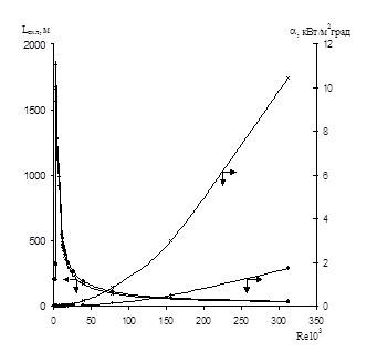 Рис. 1 Зависимость длины зоны охлаждения Lохл и коэффициента теплоотдачи a от гидродинамического режима работа трубчатого аппарата: для воды (ґ) (теплообмен) и хлорэтила (·) (теплообмен после протекания химической реакции жидкофазного гидрохлорирования этилена) при постоянной производительности (10,34 м3/ч). (Тм=374 К; Т0=278 К; Тр=293 К; Тх=283 К).