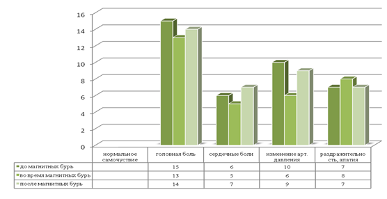 1. 45% всех участников эксперимента реагирует на резкие изменения атмосферных условий, возникающих под воздействием магнитных солнечных бурь и изменения атмосферного давления.