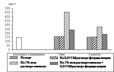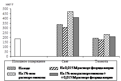 Вклад гликолиза в образование фосфотриоз исследовали в опытах с использованием ингибитора энолазной реакции гликолиза – 0,015 М раствора фторида натрия. Опыты, проведенные с зелеными проростками ячменя (рис. 4), показали, что увеличение уровня ДОАФ и ФГА в освещенных листьях, находящихся на воде (контроль), составило 84 %, а в присутствии ингибитора – 68 % от исходного содержания. Экзогенная 1%-ная глюкоза стимулировала накопление фосфотриоз на 156 %, а при добавлении фторида натрия – на 122 %. Следовательно, в зеленых листьях ячменя накопление фосфотриоз происходит и за счет их образования при окислении глюкозы по гликолитическому пути в условиях освещения.