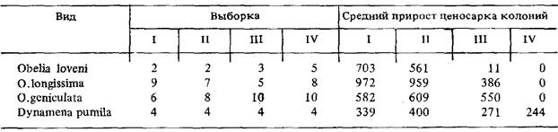 Величина прироста колонии, как правило, убывает с возрастанием скорости потока воды вокруг нее. У разных видов из числа изученных это выражалось в неодинаковой степени (табл.1).