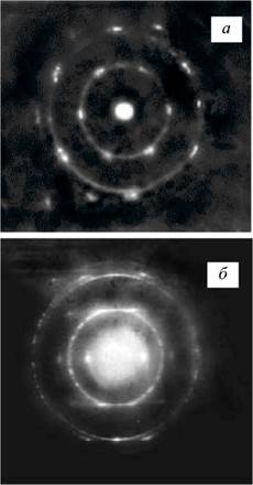 а — точечная электронограмма микрообъема волокна, характерная для крупнокристаллической структуры; б — электронограмма более дисперсной части углеродной нити