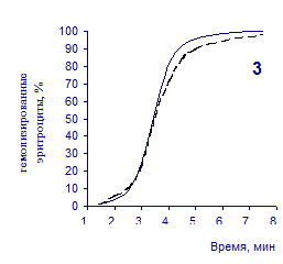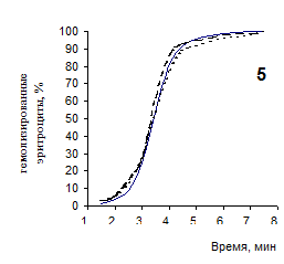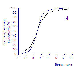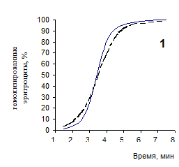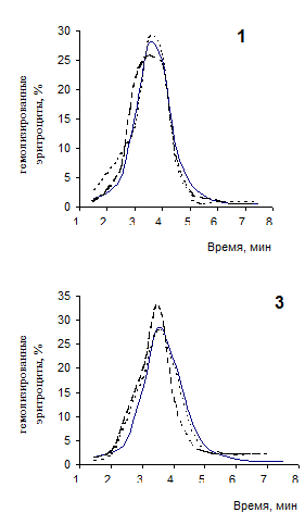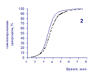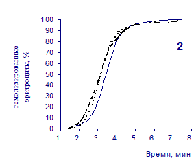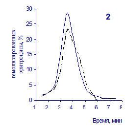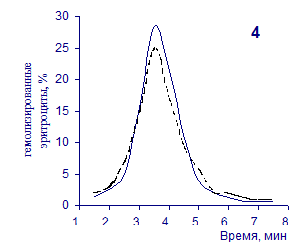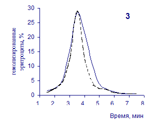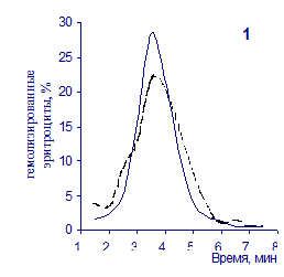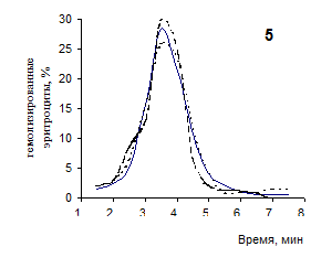 Первоначальное распределение по степеням стойкости к гемолитику эритроцитов интактных крыс отражает исходная эритрограмма. Согласно графику, процесс разрушения эритроцитов начинается через 1,5 минуты после добавления к их взвеси гемолитика, наибольшей интенсивности достигает к 3,5 минутам и заканчивается через 7,5 минут.