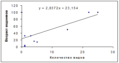 Для определения зависимости между числом видов моллюсков и возрастом водоема использовали следующий прием. Поскольку возраст рек установить невозможно, мы приняли их условный возраст за 100 лет. Возраст всех остальных водоемов нам известен. Расчет показал, что между разнообразием моллюсков и возрастом водоема существует положительная достоверная связь (n = 9, R = 0.778, P = 0.01) (Рис. 2). Результат был тем же, если возраст рек принимали за 500 и 1000 лет