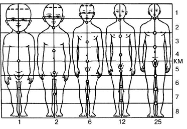 КМ — средняя линия. Цифры справа показывают соотношения частей тела у детей и взрослых,