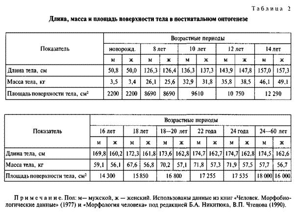Большинство антропометрических показателей имеет значительные индивидуальные колебания. В табл. 2 приведены некоторые Усредненные антропометрические показатели в постнатальном онтогенезе.