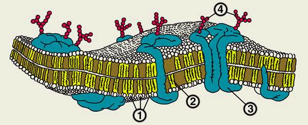 Рис. 2. Схема строения плазматической мембраны: 1 — фосфолипиды; 2 — холестерин; 3 — интегральный белок; 4 — олигосахаридная боковая цепь.