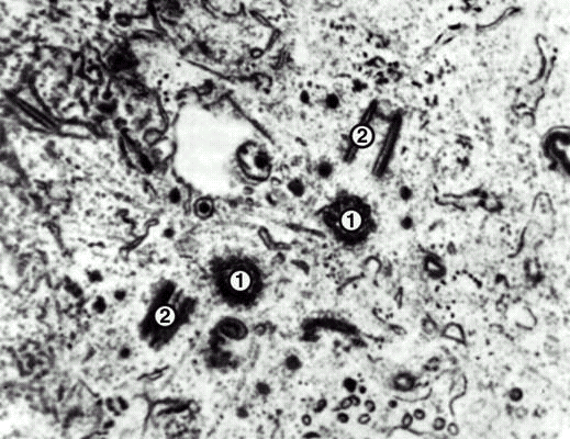 Рис. 5. Электронограмма клеточного центра (две центриоли в конце G1-периода клеточного цикла): 1 — центриоли в поперечном сечении; 2 — центриоли в продольном сечении.