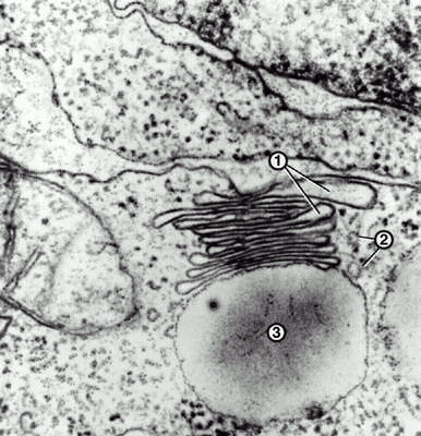 Рис. 3. Комплекс Гольджи: 1 - цистерны; 2 - везикулы (пузырьки); 3 - крупная вакуоль.