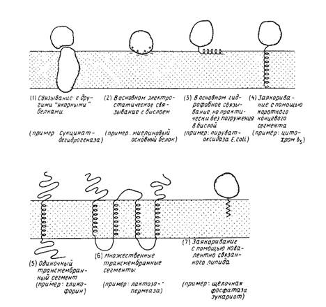 3. Связывание с помощью гидрофобного "якоря"; эта структура обычно выявляется как последовательность неполярных аминокислотных остатков (например, у цитохрома 65). Некоторые мембранные белки используют в качестве якоря ковалентно связанные с ними жирные кислоты или фосфолипиды.