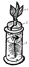 Рис. 3 Вегетационный сосуд Закса: 1 - растение кукурузы; 2 - пробка; 3 - питательный раствор.