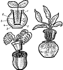 Рис. 5 Различные гидрогоршки для гравийной и водной культур: 1 - гравий; 2- наружная керамическая ваза; 3 - цветочный горшок; 4 - боковые дренажные отверстия; 5 - питательный раствор; 6 - контрольные отверстия.