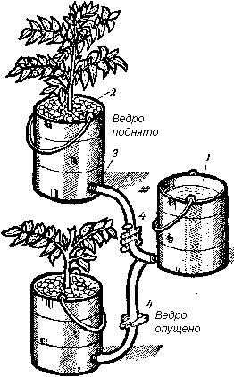 Рис. 6. Пользуясь двумя ведрами, можно производить подачу раствора методом периодического затопления (напуска): 1 - ведро с питательным раствором; 2 - ведро с субстратом; 3 - цоколь радиолампы; 4 - зажим на шланге.