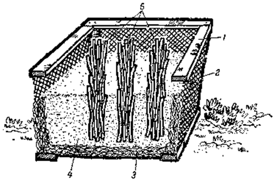 Рис. 8 Связки хвороста или прутьев облегчают увлажнение массы субстрата: 1 - основа; 2 - проволочная сетка; 3 - слой волокнистого торфа; 4 - масса субстрата; 5 - пучки хвороста.