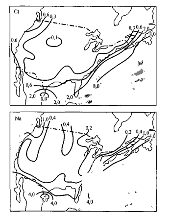 На рис. 5 показано распределение хлора и натрия – элементов, в наибольшем количестве поступающих из океана в атмосферу, в атмосферных осадках на территории США. Области повышенных концентраций приурочены к приморской полосе континентов, причем особенно сильный привнес этих элементов происходит со стороны Атлантического океана.