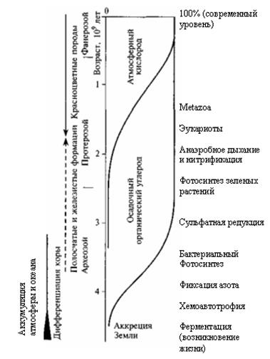 Прогрессирующее накопление органического вещества в осадках океана, изменение их состава и образование кислородной атмосферы, обусловленные биогеохимической деятельностью живых организмов на фоне геологического времени, показано на рис. 2.