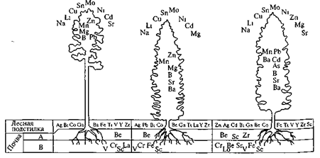 Биогеохимические процессы мобилизации металлов и включения их в атмосферную миграцию не ограничиваются деятельностью микроорганизмов и простейших фотосинтетиков. В конденсатах транспирационных испарений высших растений установлены не только соли щелочных и щелочно-земельных элементов, но также летучие комплексные органические соединения металлов. По Л.Г. Бондареву (1981), транспирируемая растениями вода имеет минерализацию 40 мг/л, и растительность всей суши выносит в атмосферу путем транспирации (1,2–1,4)×109 т минеральных веществ. Растения выделяют многочисленные газообразные соединения, количество которых оценивается в 1,5×109 т/год (Исидоров В.А., 1985). Для хвойных деревьев характерно образование терпенов, для лиственных – изопренов. Л.Г. Бондарев полагает, что 1 га лиственного леса продуцирует в сутки около 2 кг летучих соединений, а 1 га хвойного леса – от 4 до 30 кг, и допускает, что таким образом выделяется в тропосферу до 0,5×109 т/год летучих органических соединений, содержащих (4–5)×103 т минеральных веществ.