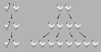 Если мы сравним размножение бесполых (не рекомбинирующих) и половых (регулярно рекомбинирующих) организмов, нам сразу бросится в глаза поразительная неэффективность последнего варианта размножения. Представим себе два острова. На одном живут самец и самка, способные к половому размножению и, следовательно, к рекомбинации. На другом - две самки, размножающиеся бесполым путем. Ограничим плодовитость и тех и других самок двумя потомками. После первого же цикла размножения на бесполом острове родится четыре потомка, а на половом - два. Если на половом острове оба родившихся детеныша будут одного пола, то на этом вся история закончится. Если на свет появятся самка и самец, то эта пара произведет еще двух потомков, а на бесполом острове их родится уже восемь. Таким образом, при заданных условиях численность популяции бесполого острова будет расти экспоненциально, а на половом она так и останется равной двум особям. Очевидно, что эффективность бесполого размножения значительно выше (рис.1).