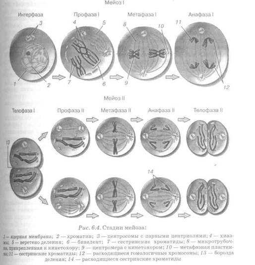 Мейоз {греч. meiosis — уменьшение) — способ деления клеток, приводящий к уменьшению в них числа хромосом вдвое. Мейоз служит ключевым звеном гаметогенеза у животных и спорогенеза у растений, в результате которого из диплоидных клеток образуются гаплоидные клетки. Мейоз протекает сходно почти у всех организмов. Он состоит из двух последовательных клеточных делений — мейоза I (первое деление) и мейоза II (второе деление), разделенных непродолжительным периодом интеркинеза. При этом репликация ДНК предшествует лишь первому делению. В каждом из делений мейоза различают те же четыре стадии, что и при митозе: профазу, метафазу, анафазу и телофазу, которые, однако, имеют некоторые особенности (рис. 6.4, 6.5).