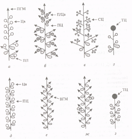 Рис. 1. Схема мутантных соцветий и соцветий дикого типа арабидопсиса (а-г) и львиного зева (д-з): а - соцветие арабидопсиса дикого типа; б - соцветие мутанта Ify; в - соцветие мутанта apl; г - соцветие мутанта tfl1; д - соцветие львиного зева дикого типа; е - соцветие мутанта flo; ж - соцветие мутанта sgua; з - соцветие мутанта cen; ПГМ - по беговая генеративная меристема; Цв - цветок; ПЦ - прицветник; П/Цв - прицветник/цветок; СЦ -соцветие; ГЦ - терминальное соцветие; ВГМ - внутренняя генеративная меристема; ЛЛ – прилистник