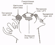 Рис.2. Схематическое изображение генеративного побега арабидопсиса и начальные этапы экспрессии генов, регулирующие развитие цветка.