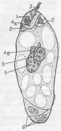 Рис.6. Зародышевый мешок (женский заросток) покрытосемянного (цветкового) растения и двойное оплодотворение: 1 - яйцеклетка; 2 - клетки-помощницы; 3 - вскрывшаяся пыльцевая трубка. Один из спермиев (4а) сливается с яйцеклеткой; 5 - полярные ядра, сливающиеся со вторым спермием (46); 6 - три клетки в нижней части зародышевого мешка (антиподы).