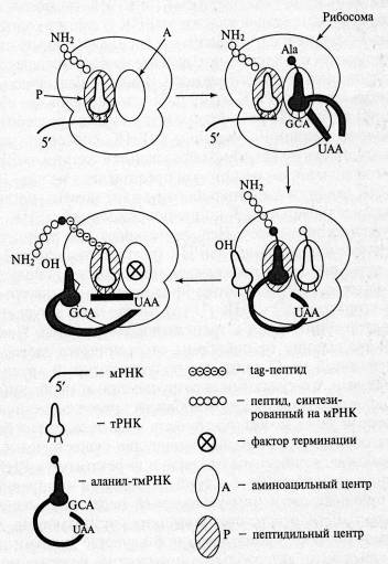 Матричная часть тмРНК кодирует пептид, являющейся сигналом узнавания специфическими протеазами (tag-пептид). тРНК-подобная часть может быть аминоацилирована. В аминоацилированном состоянии тмРНК взаимодействует с рибосомой, запрограммированной мРНК, в которой в результате случайной деградации отсутствует стоп-кодон. В результате такие рибосомы оказываются "арестованными", они не могут освободиться от мРНК, тРНК и пептида и не могут участвовать в трансляции нужных клетке мРНК. После взаимодействия с тмРНК трансляция переключается на матричную часть этой РНК, что приводит к считыванию tag-пептида, кодируемого матричной частью мРНК. В результате tag-пептид присоединяется к недосинтезированному пептиду, который содержится в рибосоме до ее взаимодействия с тмРНК. При этом происходит терминация трансляции на стоп-кодоне матричной части тмРНК, а пептид, освободившийся из рибосомы, содержит участок, узнаваемый специфическими протеазами, что способствует его быстрой деградации.