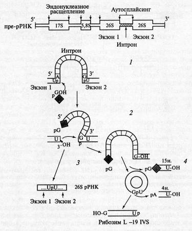 Аутосплайсинг индуцируется гуанозином, гидроксильная группа которого атакует фосфатную группу на 5'-конце интрона, в результате чего разрывается межнуклеотидная (фосфодиэфирная) связь и высвобождается З'-конец экзона 1. Затем гидроксильная группа, содержащаяся на З'-конце экзона 1, атакует фосфатную группу на З'-конце интрона, что ведет к вычленению интрона и замыканию фосфодиэфирной связи между ОН-группой З'-конца экзона 1 и 5'-фосфатной группой экзона 2. Таким образом в результате реакции трансэтерификации без дополнительных затрат энергии осуществляется лигирование двух экзонов с образованием зрелой 26S рРНК. Вырезанный интрон затем циклизуется. Из его состава путем двухэтапного ауторасщепления освобождается фрагмент, содержащий 19 нуклеотидов, в результате чего образуется РНК длиной 376 нуклеотидов (L-19 IVS), которая и представляет собой истинный РНК-фермент (рибозим), обладающий каталитическими свойствами. Этот рибозим обладает устойчивой структурой, имеет эндонуклеазную активность, расщепляя длинные одноцепочечные РНК.